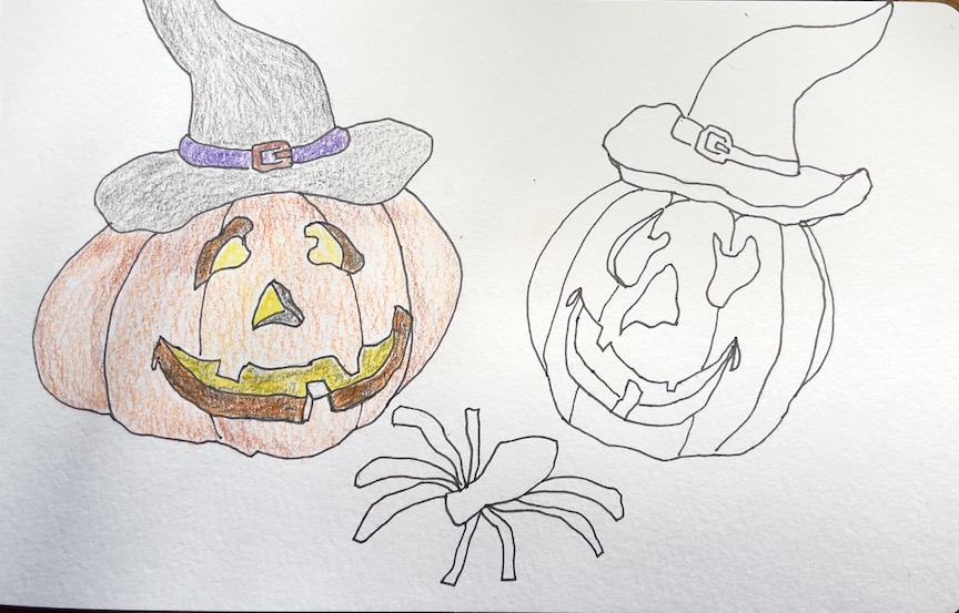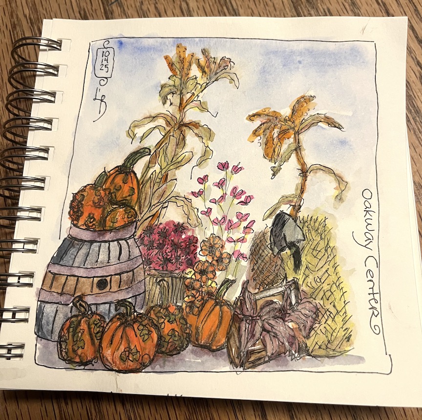 Bundled up, we braved the cold. Sitting in sunlet patches we enjoyed sketching the wonderful Fall displays at Oakway Center. Also below Zoomers share too.